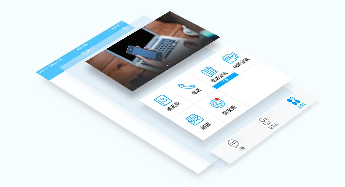 新(xīn)版i信的整體(tǐ)风格更加简洁,如何在简洁中(zhōng)突出重要功能(néng)就成為(wèi)思考的重心。我们运用(yòng)视觉表现手法,将信息归类与划分(fēn)主次,以统一的设计元素、清新(xīn)的色块和留白设计區(qū)分(fēn)内容,使用(yòng)户在使用(yòng)中(zhōng)自然的完成操作(zuò),增加用(yòng)户对产(chǎn)品的积极性。